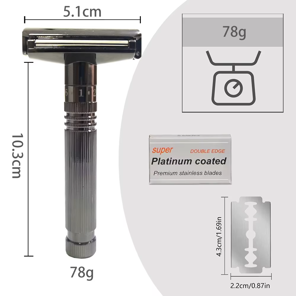 1. **Precision Adjustment**: Features an adjustable dial that allows you to customize the blade exposure for a shave tailored to your skin sensitivity and hair thickness. 2. **Durable Construction**: Made from high - quality materials, this safety razor is built to last, offering long - term use compared to disposable razors. 3. **Cost - Effective**: With replaceable blades, it saves you money in the long run as you don't need to keep buying entire new razors. 4. **Eco - Friendly**: Reduces plastic waste associated with disposable razors, making it a more sustainable grooming choice. 5. **Close & Comfortable Shave**: The design ensures a close shave while minimizing irritation, providing a smooth and comfortable experience.