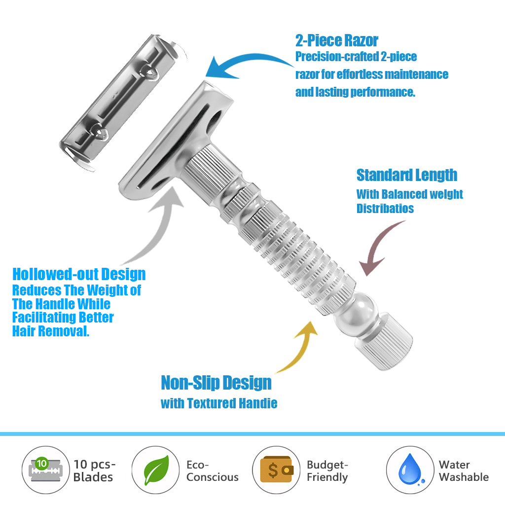 Durability: Unlike expensive disposable cartridge razors, this metal razor is built to last a lifetime. The reusable razor is made from high-quality, durable metal. The entire razor and all replacement blades are plastic-free, making it 100% reusable and recyclable.