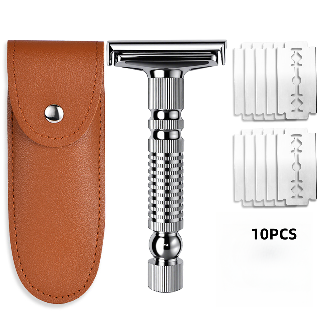 Package contents: one single-blade safety razor, 10 safety razor blades, one blade holder, and one leather case. The all-metal safety razor ensures durability and sharpness, delivering a long-lasting, close, and clean shave. This makes it an ideal gift for birthdays, anniversaries, Christmas, Valentine's Day, and Father's Day.