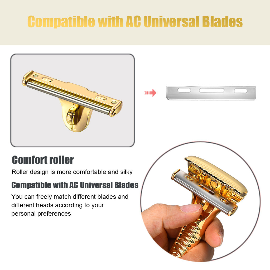 Multiple options: The safety razor includes universal AC blades. The single-blade safety razor offers choices between a roller blade holder and a comb blade holder. You can select the blade holder that suits your personal preferences. The blades are AC razor blades.
