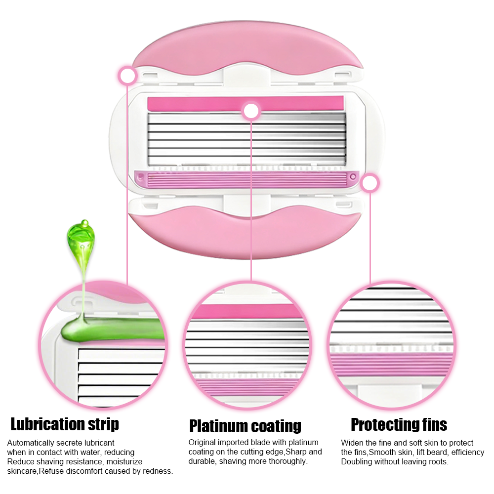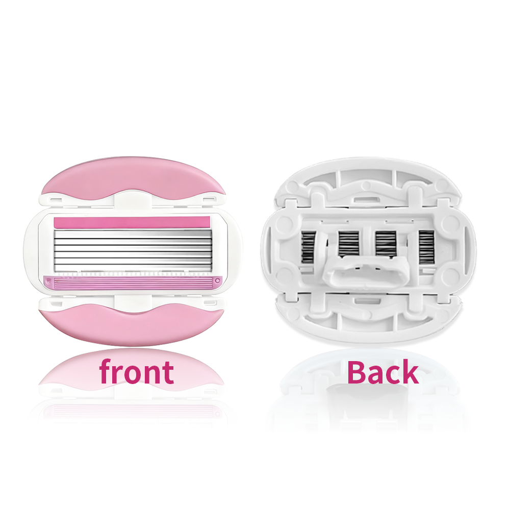 1. **Ergonomic Handle Design**: The handle is crafted with an ergonomic shape and non - slip texture, ensuring a comfortable and secure grip during use, even when hands are wet. 2. **Multi - Blade System**: Features a multi - blade setup that allows for a close and smooth shave in a single pass, effectively removing hair with less effort. 3. **Skin - Friendly Protection**: Equipped with skin guards or lubricating strips (as suggested by the design), it helps to minimize irritation and provide a gentle shaving experience for sensitive skin. 4. **Easy Blade Replacement**: The razor head is designed for simple and quick blade replacement, making maintenance hassle - free. 5. **Vibrant Aesthetic**: Boasts a lovely pink and white color scheme, adding a touch of charm and making it an attractive addition to your bathroom essentials.